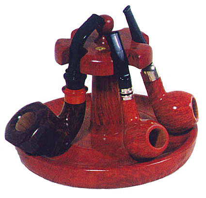 This stand holds five (5) pipes and is made of solid briar burl. Briar is the root of the Heath bush which is used in the production of most pipes.