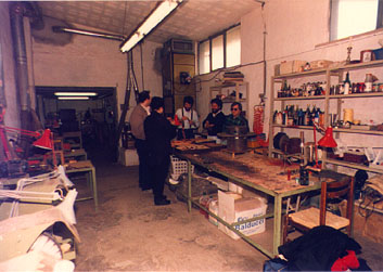 Long shot of workshop, with buffing wheels on left. The staining area is on the right, with various stains and compounds on the shelves. The lathes, saws and sanders are in the rear section which are difficult to see in this photo. The sandblasting unit sits outside the main workshop area. Photo ref: FT1011
