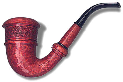 Kalabash shape with a modified Rowlette finish. Stem separates from shank at the knurled ring. Bowl and shank are one piece, there is no bowl insert.
